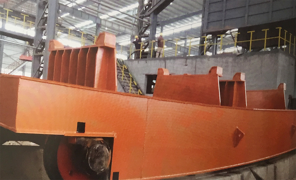 鋼包車裝置由鋼包車體、傳動裝置、車輪、鋼包導向座以及拖纜裝置和軌道清理器等組 成。由鋼板和型鋼組焊成的矩形梁構成框架式的車體,車體在四個角上設有加強支撐,由電 動機經聯軸器帶動減速器傳遞到兩個車輪上,驅動鋼包車運行,鋼包車共設四個車輪, 雙驅動裝置,各車輪裝在軸承座上,輪子前端設有軌道清理器,以清除軌道面上的散落物。